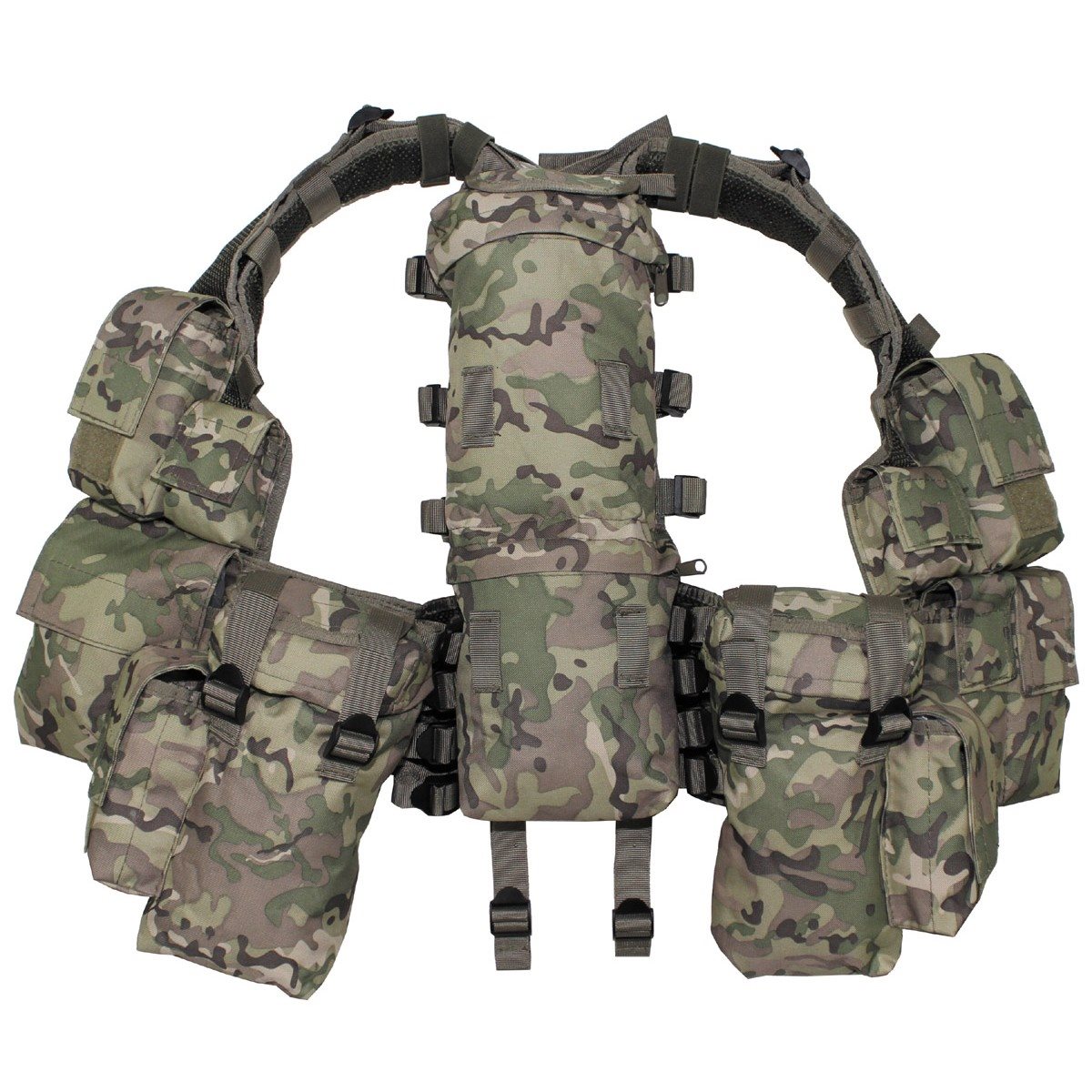 Rendkívül sokoldalú mellény. Állítható, párnázott váll és oldal pántokkal. Nagy hátsó zseb, fegyvernek vagy víztartálynak. A zsebek tépőzárasak. Dupla tártartó és sok más praktikus zseb. Anyaga 100% Polyester. 12 Zsebbel